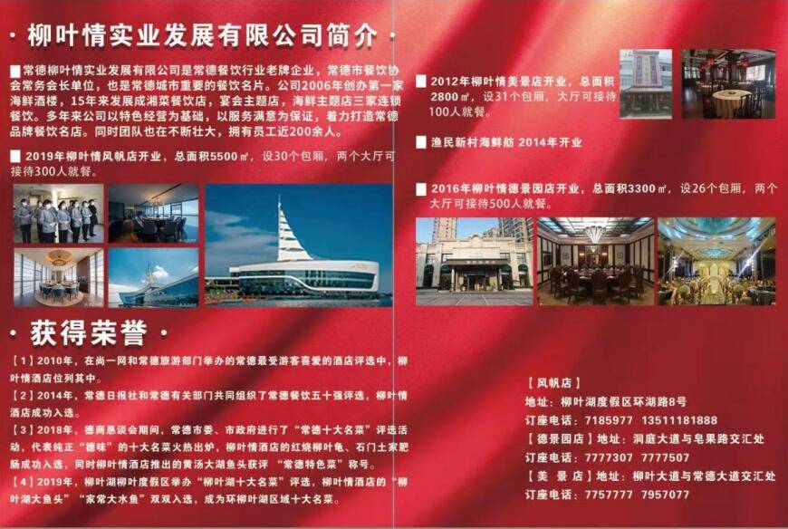 常德柳叶情实业发展有限公司是常德餐饮行业老牌企业,常德市餐饮协会常务会长单位,也是常德城市重要的餐饮名片。公司2006年创办第一家海鲜酒楼,15年来发展成湘菜餐饮店,宴会主题店,海鲜主题店三家连锁餐饮。多年来公司以特色经营为基础,以服务满意为保证,着力打造常德品牌餐饮名店。同时团队也在不断壮大,拥有员工近200余人。